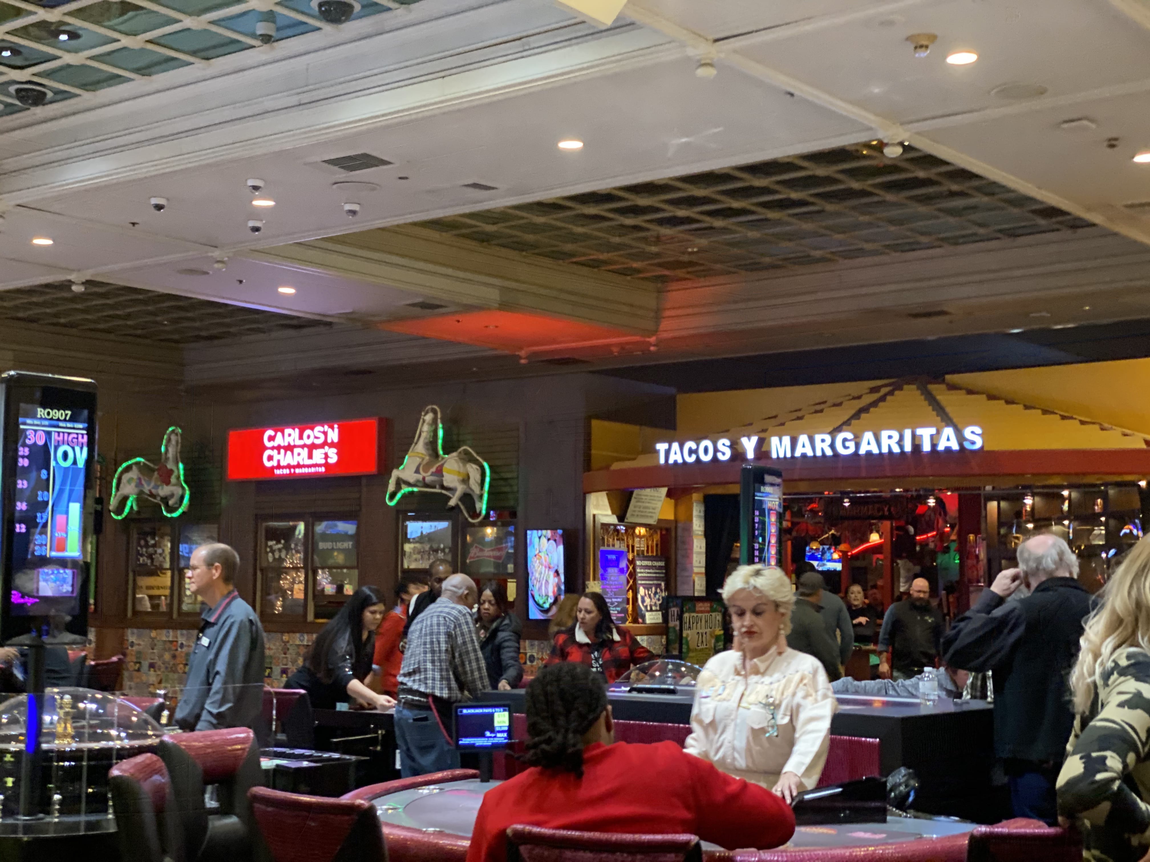 It’s right off the casino floor at the Flamingo and also has outdoor terrace overlooking the Flamingo gardens. It’s got a bar both inside and out so you can stop off for a drink anytime and any weather.