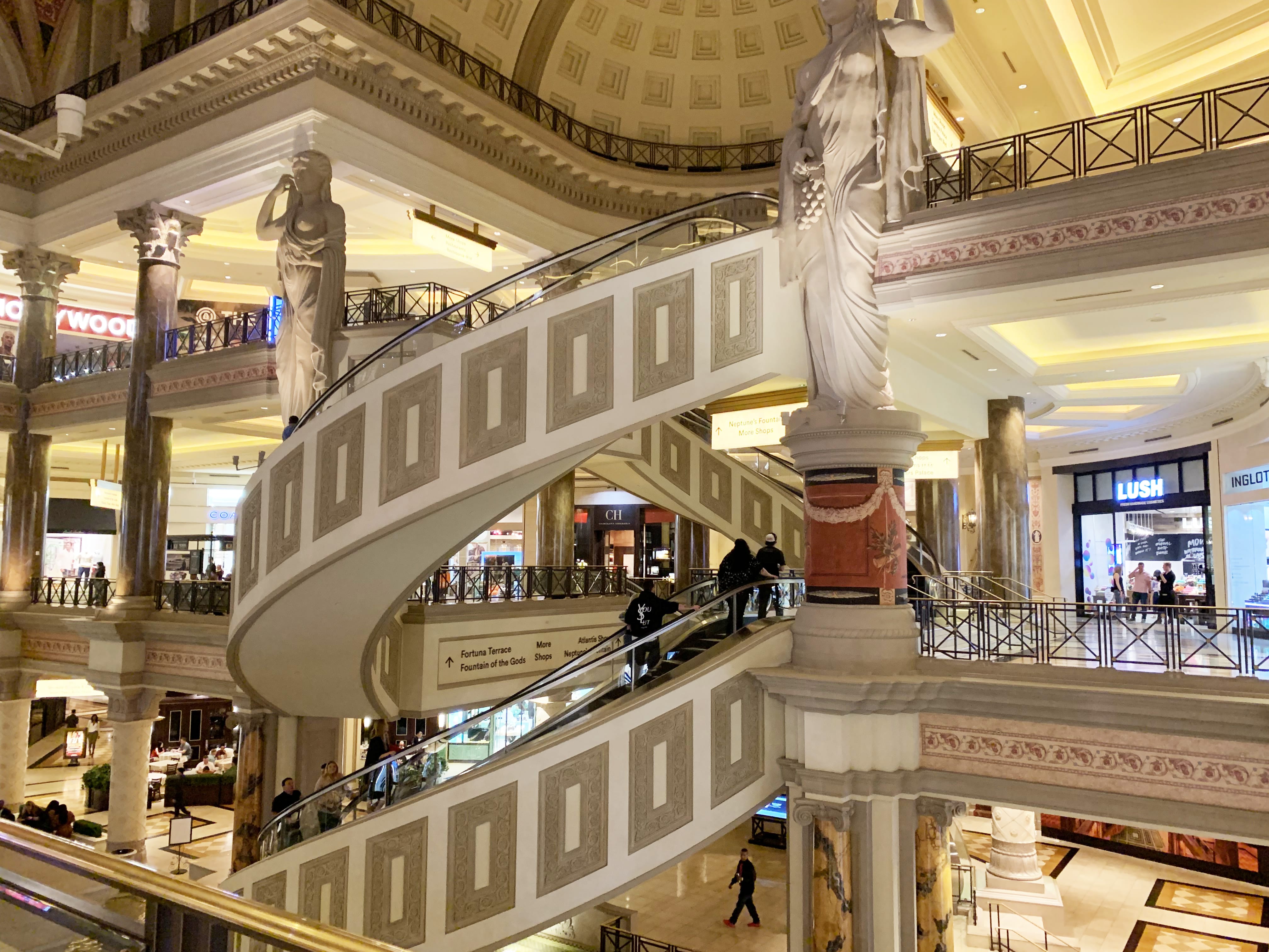 The grander entrance is the one from the Strip. This takes you up two levels on some spectacular spiral escalators. You do, however, get taken on a long winding path, past most of the shops before decending down two straight escalators to the end main mall. The simpler way in is via the casino, which brings you right into the centre of the mall.
