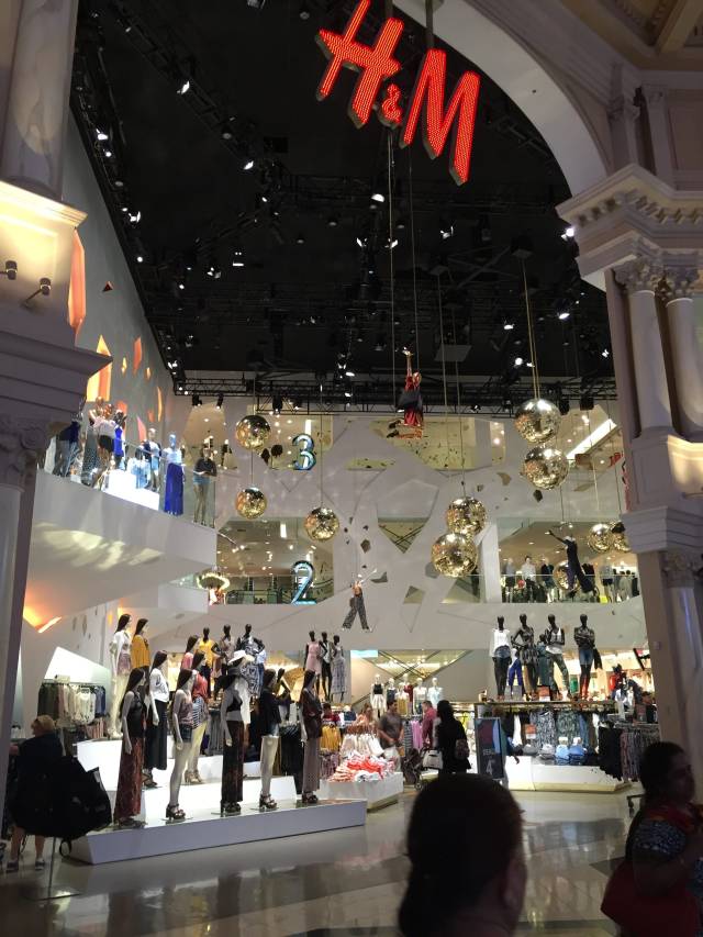 The shops have become more high end over the years, for example there are large Versace, Gucci, Dior and Louis Vuitton stores. Highlights for me are the Apple Store (one of three located near to the Vegas Strip), H&M (the world’s largest H&M store) and the large Vegas souvenier shop at the far end. It also boosts the US’s largest watch shop, Tourneau.