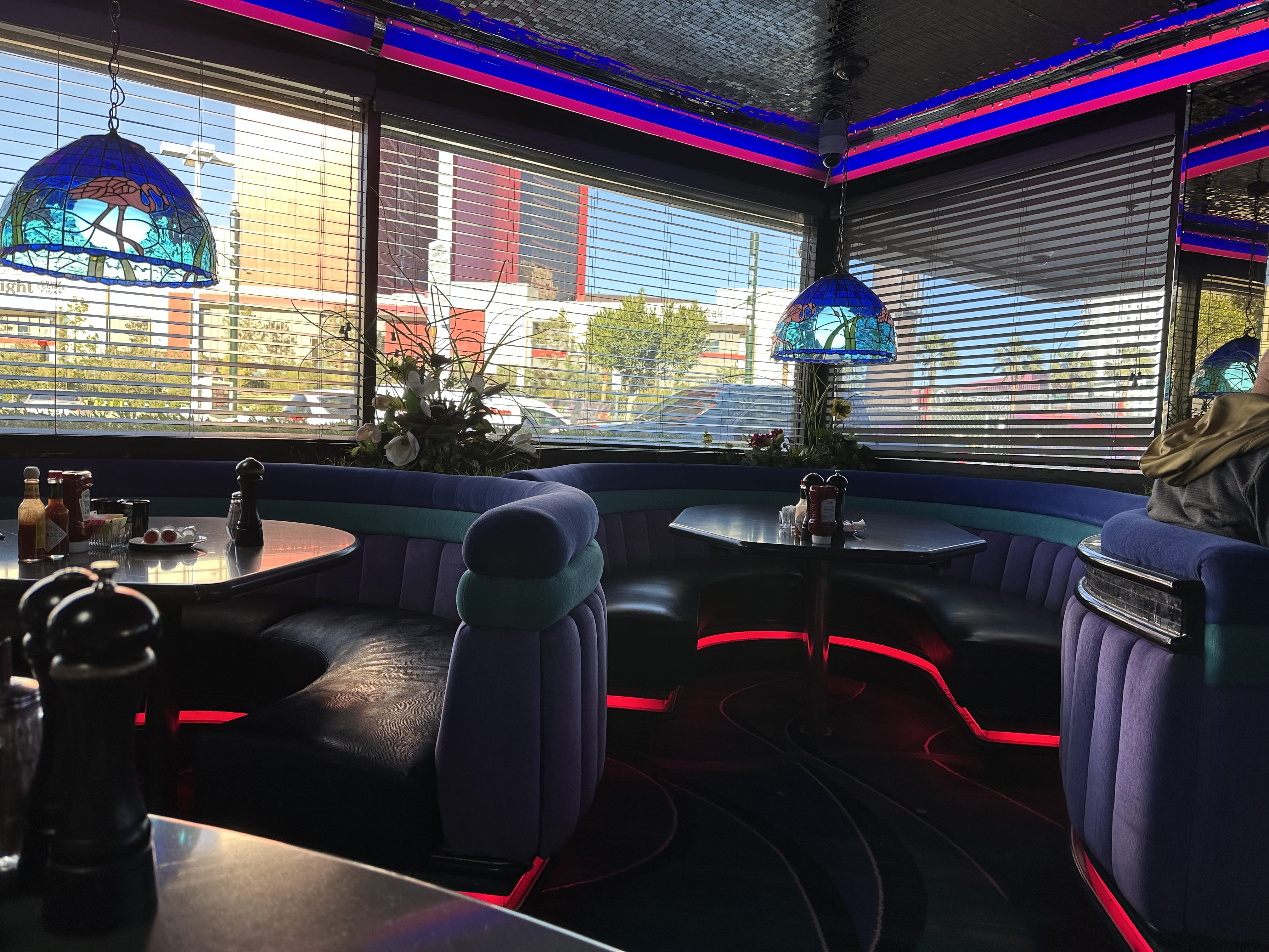 It’s part diner and part fireside lounge. So both daytime visits and nightime visits are catered for. I opted for brunch in the diner. The interior is about as Vegas as it gets, with a mirrorball ceiling, neon and fake trees. The tables are all curved booths, all facing in different directions. You even get that rainbow-coloured sugar in a retro sugar shaker, I’ve not seen that since the 70s!