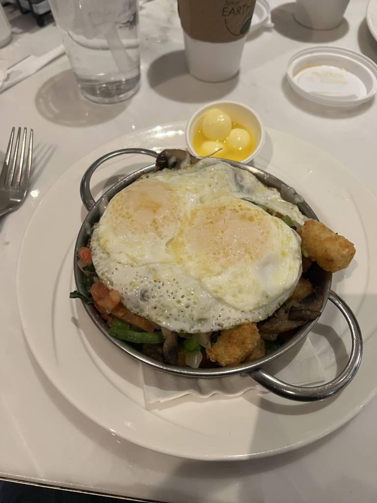 Try the skillets, which are basically tater-tots (remember frozen oven-crunchies? It’s those) mixed with all your breakfast items, topped with your choice of eggs. Just what you need after a night out the night before!