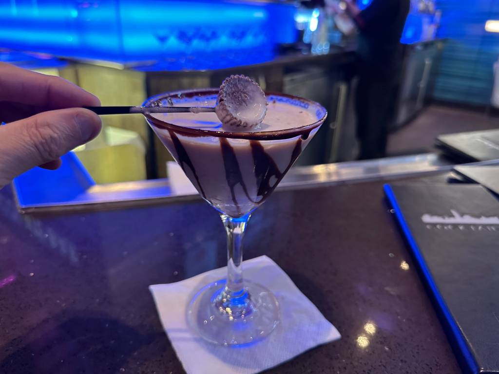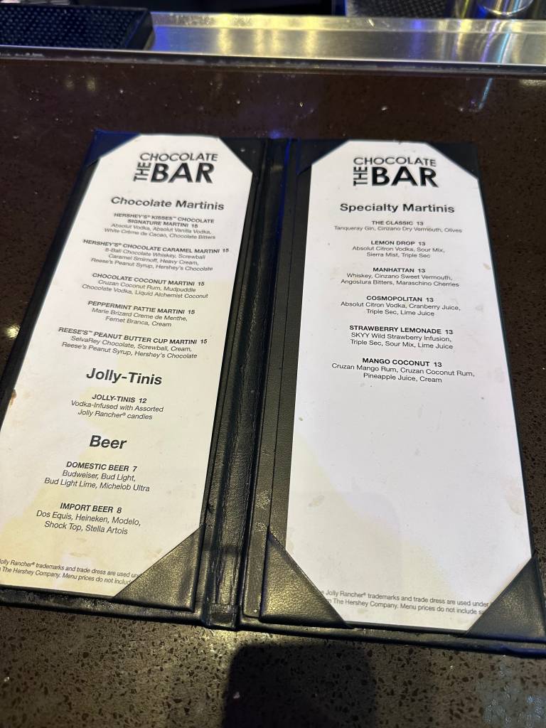 There are five chocolate martini’s to choose from based around Hershey’s-branded chocolate bars. Each gets a chocolate-sugar rim and a garnish of a mini-chocolate on a stick.
