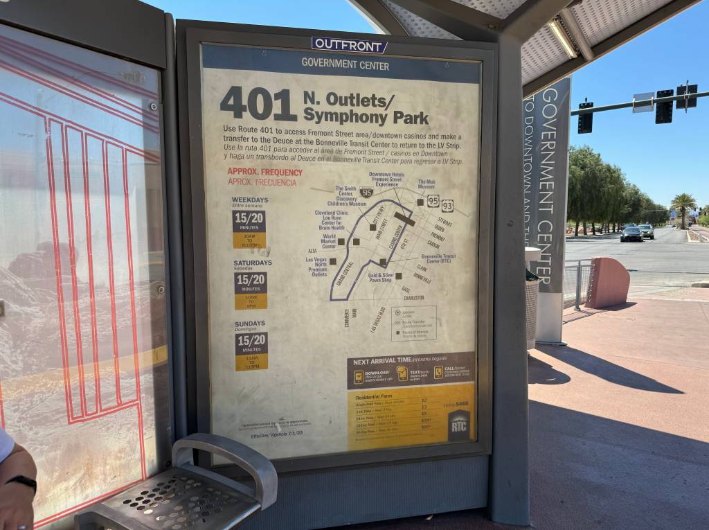 To return, take the 401 bus from the same stop outside the outlets back to the transit center. This will take you downtown first, so I often get out for a visit to downtown and Fremont Street on my way back.