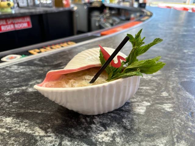 Their signature cocktail is the Soggy and Sandy, which is served in a variety of novelty ceramic containers. It’s a refreshing blend of Jameson’s orange whisky liquer, creme de banane, coconut cream and tropical juices. Perfect for a hot Vegas afternoon!